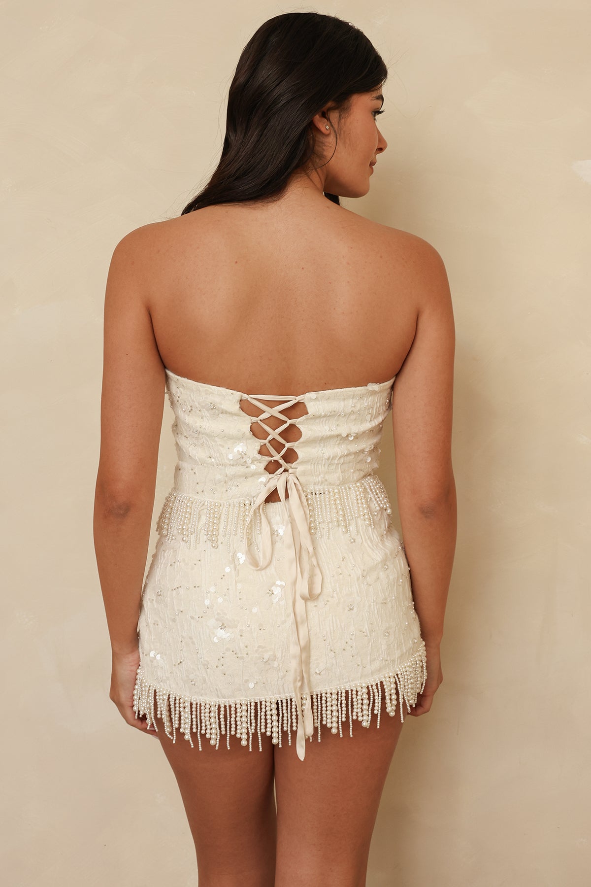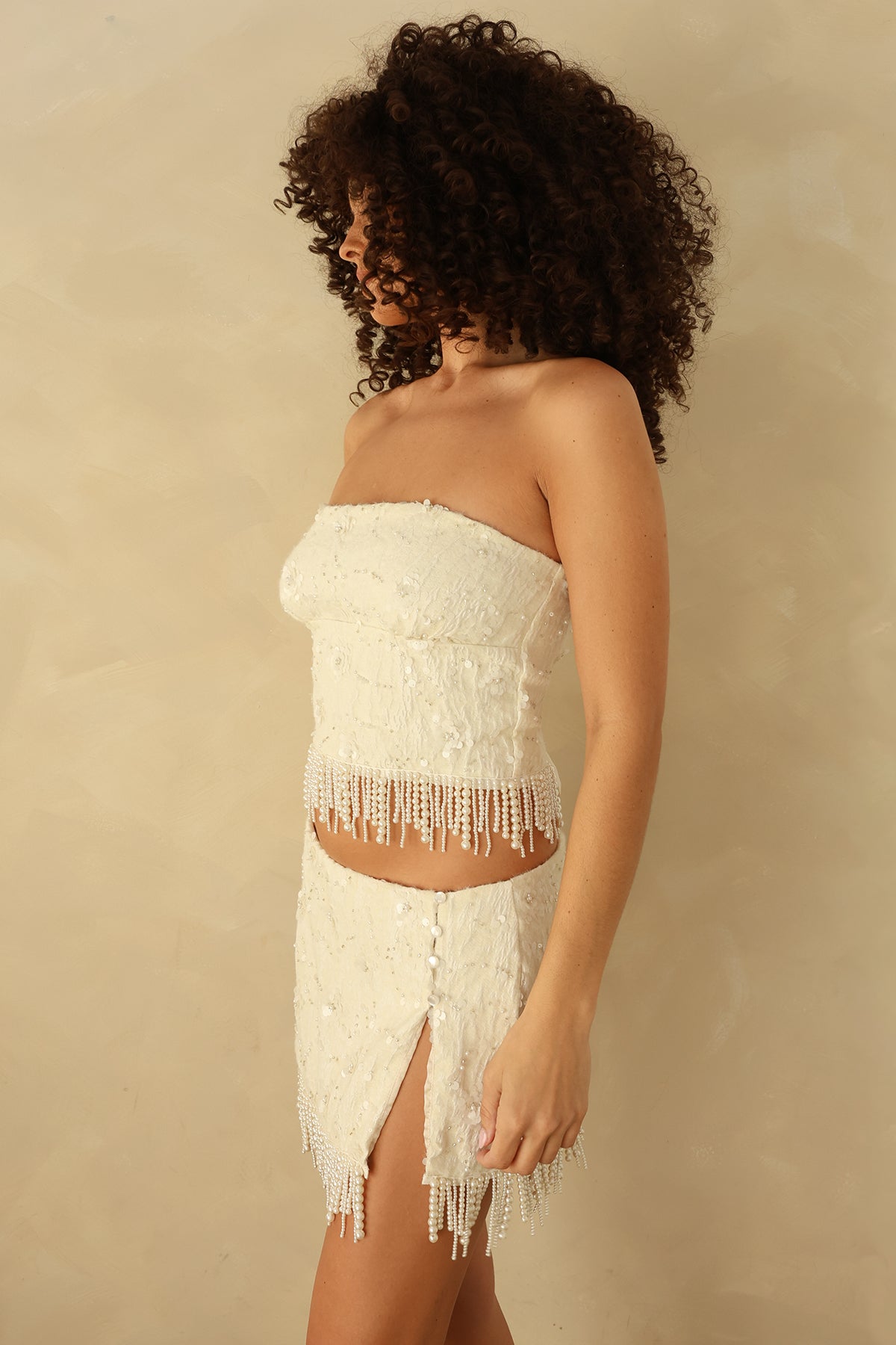 A statement strapless top designed in a beaded floral fabric, featuring beaded fringe and corset-style ties at the back. Pair with our Champagne Skirt to complete the set.