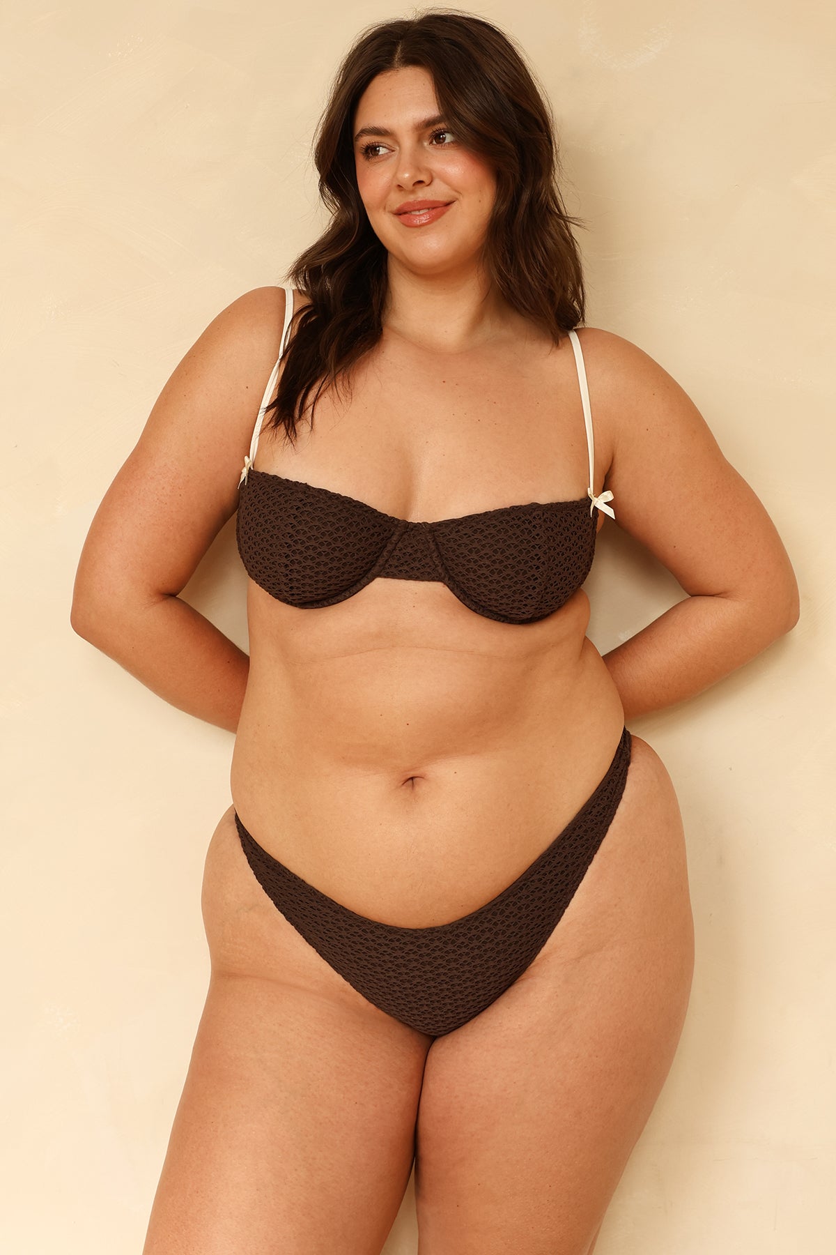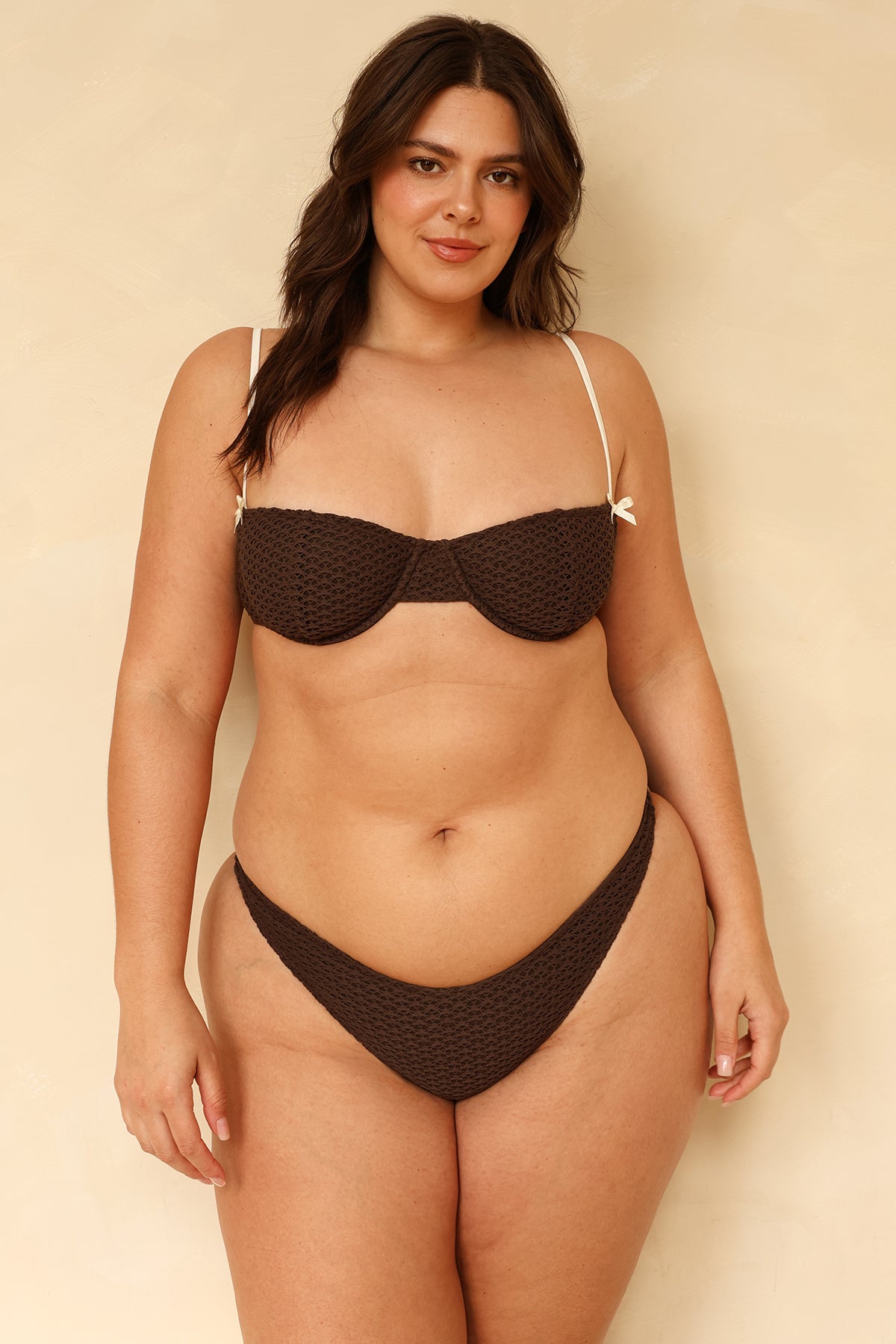 Our new slightly-cheeky bikini bottoms are designed in our soft fishnet fabric. Made to match with our new Declan Top.