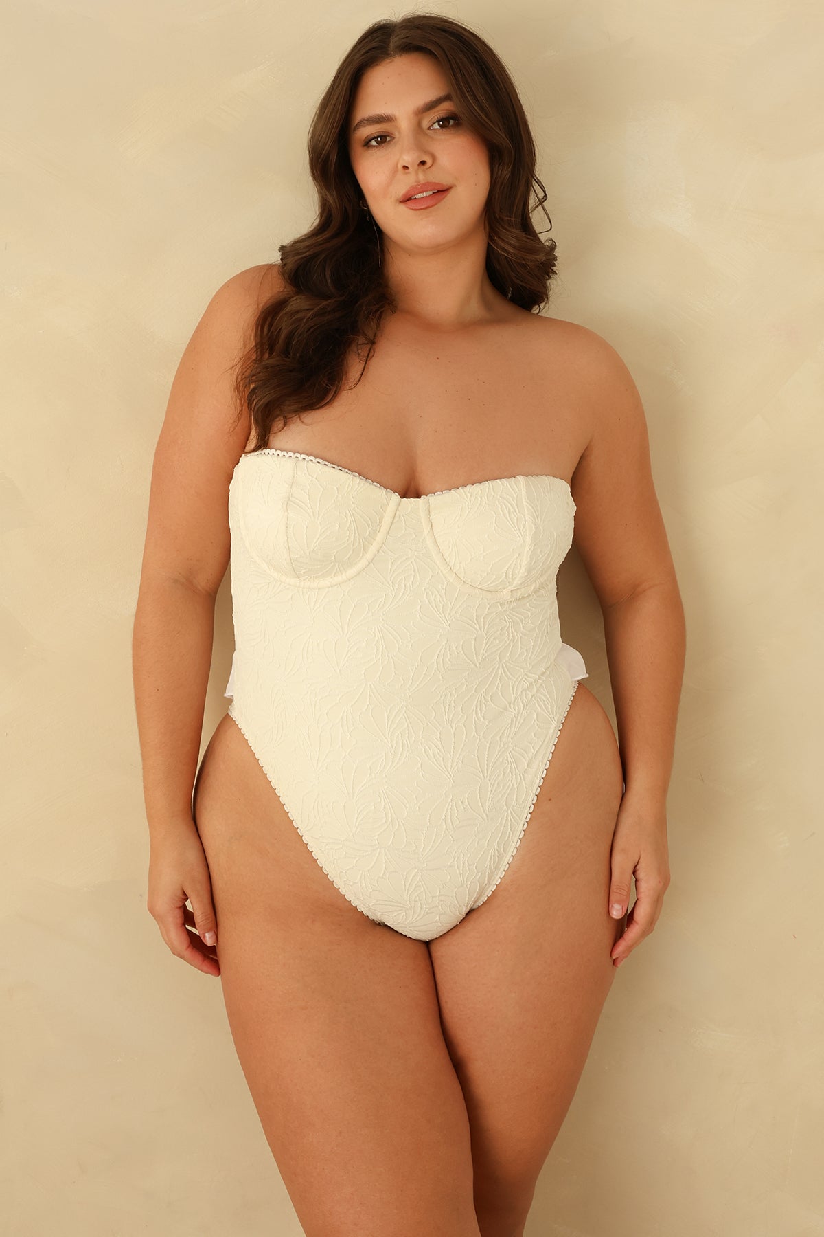 Our new strapless one piece features an underwire bra, lace trim, and a sexy open back. Accented with a big bow at the back.