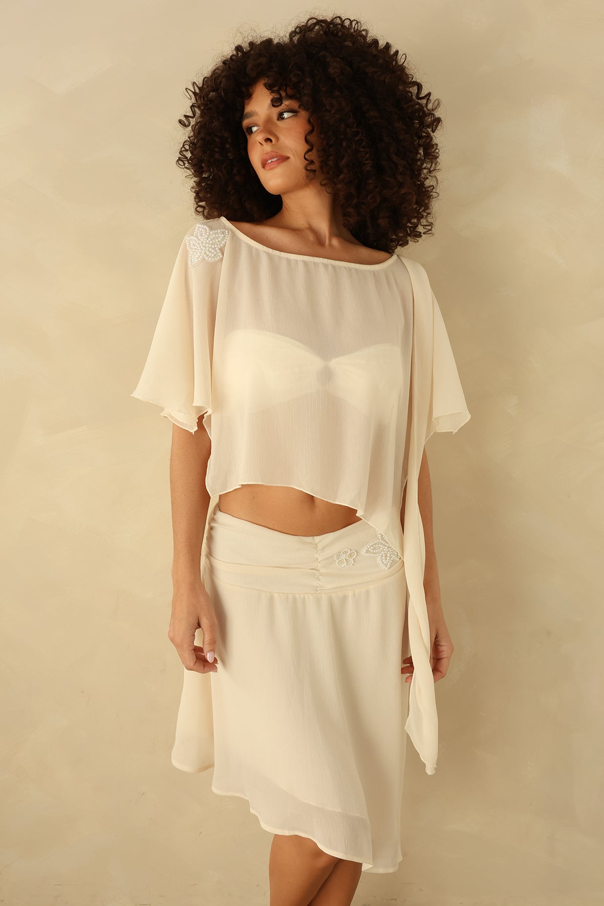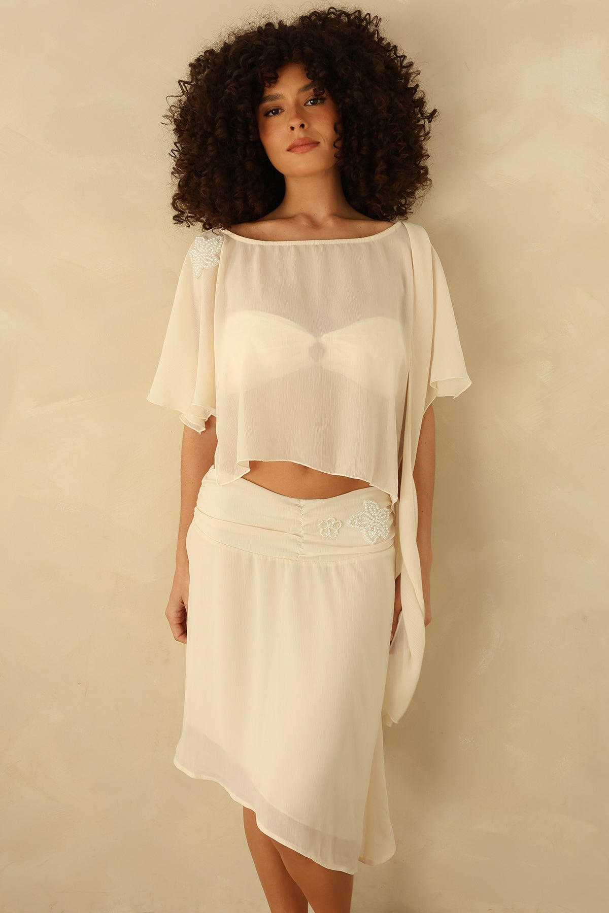 A low-waisted skirt with a thick waistband, asymmetrical bottom hem and flower embroidery to match back with our Borrowed Bliss Top.