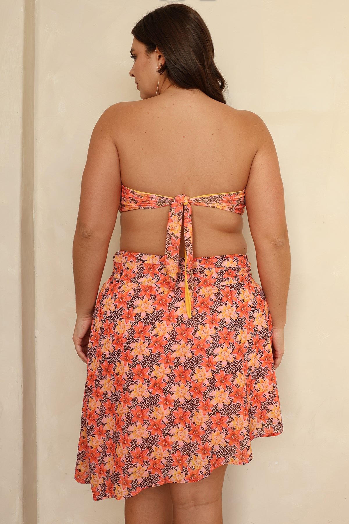 Our new cover-up style skirt features a wide waist band, asymmetrical hem and zipper on the side. Pairs well over our matching Primavera One Piece.