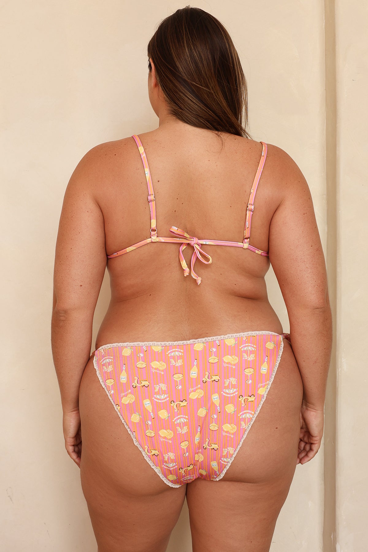 Our super-cheeky string bikini bottoms featuring a gorgeous lace trim. Valentina’s adjustable strings on each side allow for a customizable fit, and its low-waist design will flatter all your angles. Pair with our Emilia Top to complete your set.