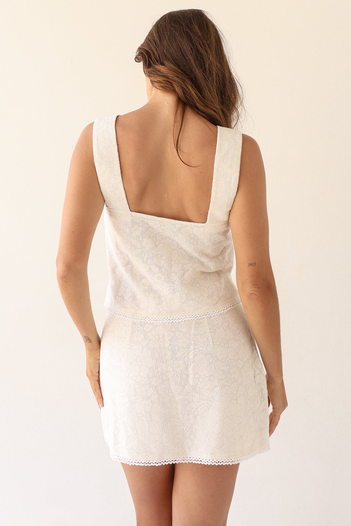 Our new lightweight mini skirt features a red trim and tie at the front with layered fabric and a side slit that adds some eye-catching detail. Wear with our Iris Top to complete the set.